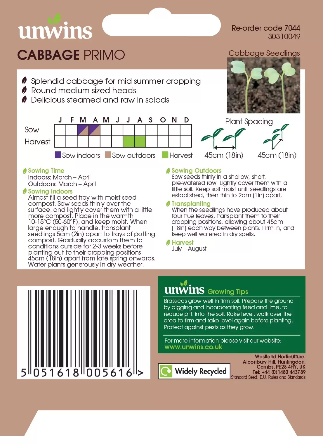Primo is a splendid cabbage for mid summer cropping. The round, medium sized heads are produced on neat compact plants, and are delicious steamed, raw in salads or used for delicious, homemade coleslaw. Summer/Autumn harvest. Heirloom variety.