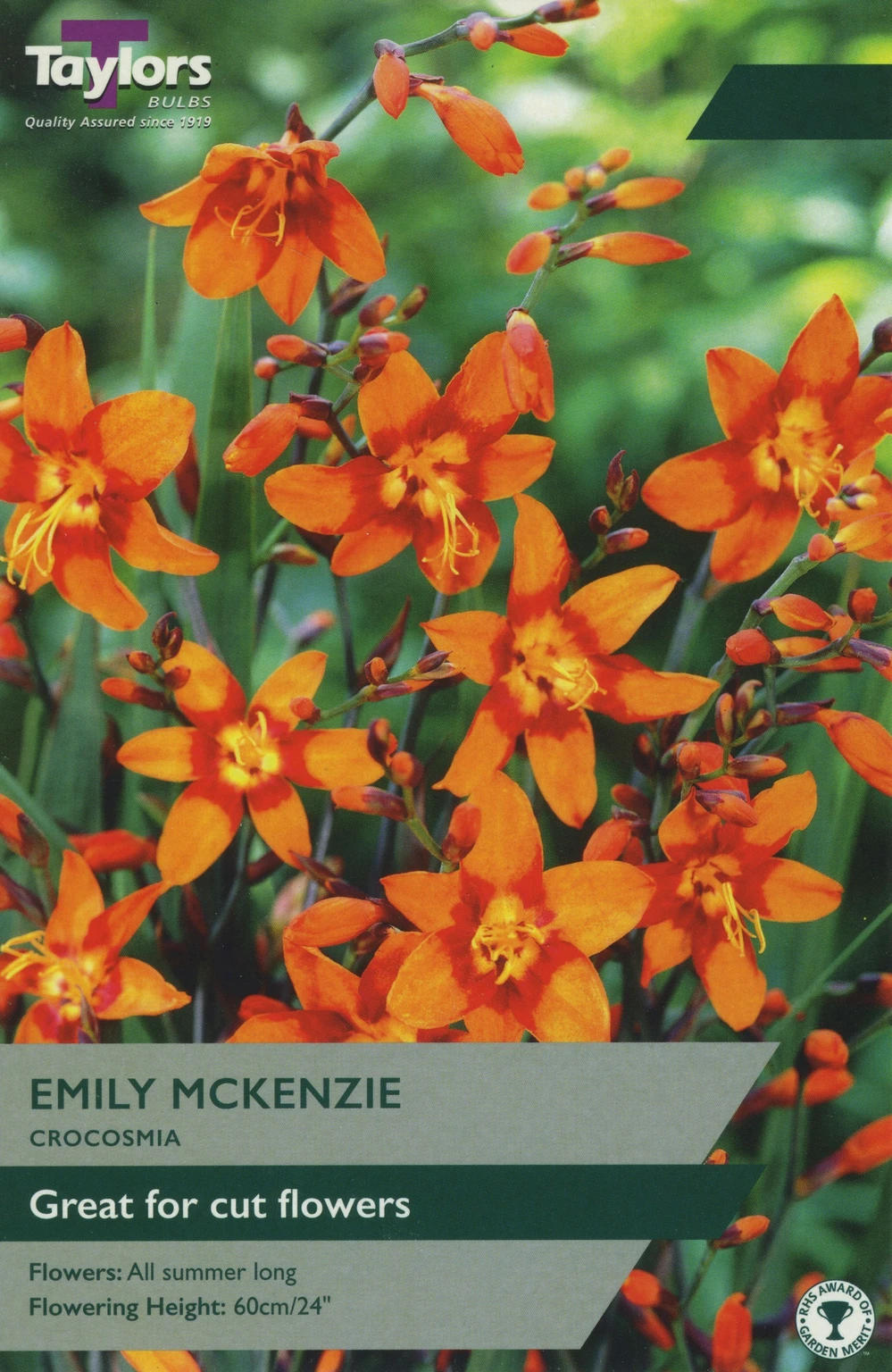 Crocosmia Emily Mackenzie is an orange flower with a red eye and is ideal for cut flowers, 8 bulbs per pack, Flowering all summer with a height of 60 cm. Plant in March onwards 5cm in depth and 10cm distance apart. Crocosmia like well-drained soil in a sunny, open position.
