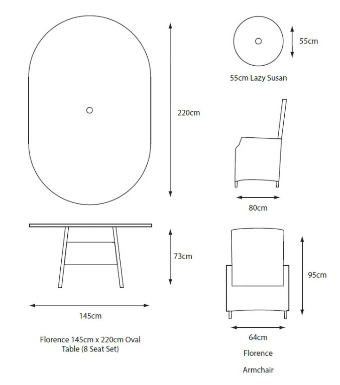 The Florence 8 Seat Oval Dining Set with Weave Lazy Susan, Deluxe 2.0 x 3.0m Parasol is designed for style and comfort.