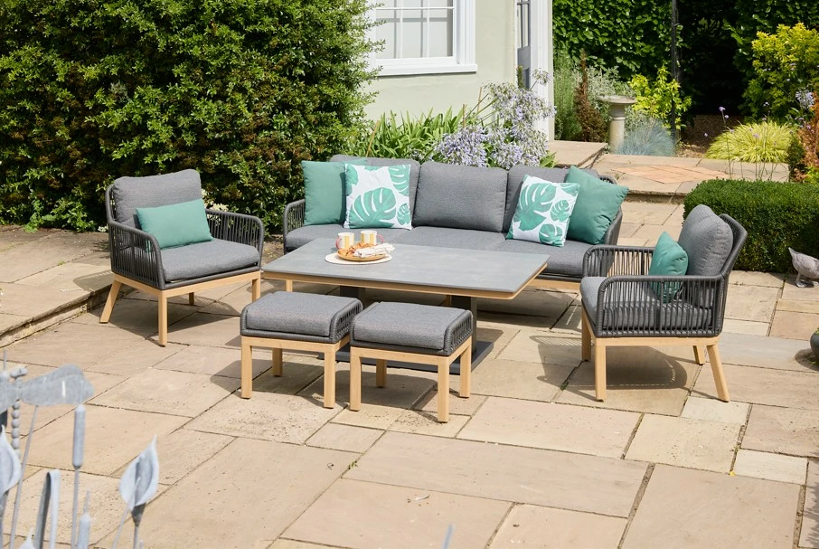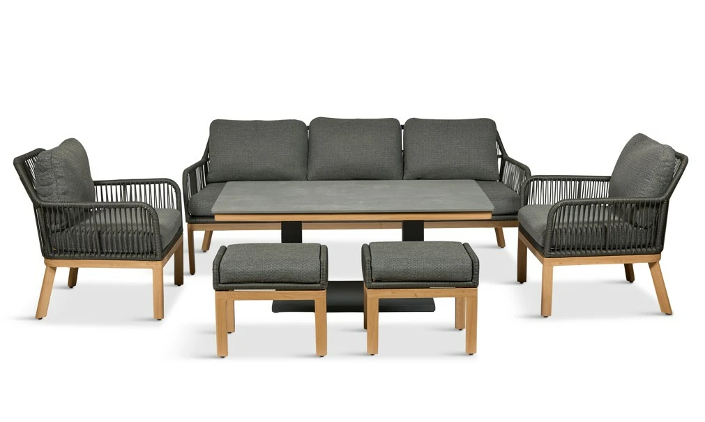 The Peru Charcoal Everope Collection combines clean, contemporary lines with classic outdoor durability. Its tightly woven PE rope forms a striking, modern pattern, while the stone-effect Stone-Tek tabletops contrast beautifully with wood-effect frames for a sophisticated look.